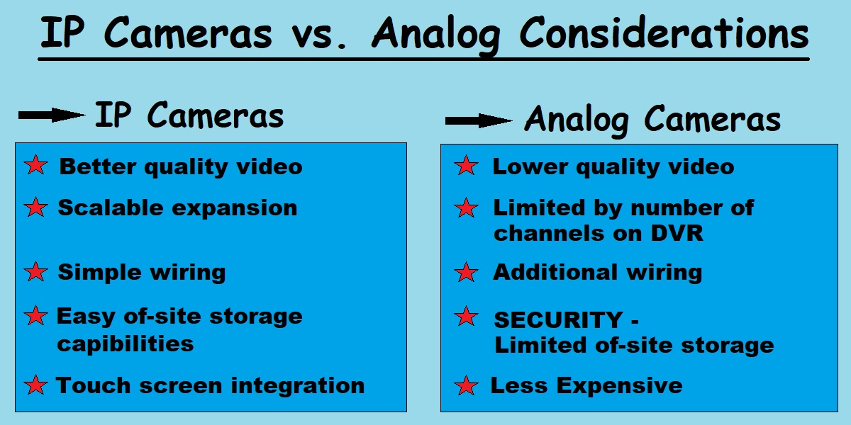 With IP you do have scalable option opposed to the Analog system with the limited channels of the DVR you can take your IP and arm it with additional hardware such as with Ethernet switches and have many more cameras than with your traditional analog system.