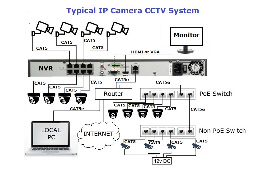 The digital video stream is then broadcast over the local area network (LAN) using Ethernet (CAT5 or CAT6) cable. Power is supplied to the cameras through the ethernet cable via Power-Over-Ethernet (POE) adapters built into the cameras and at the (POE enabled) switch.