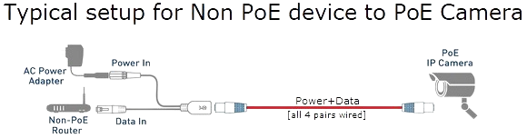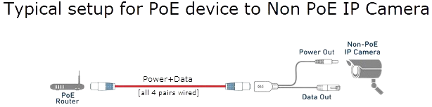 The female RG-45 connector receives the PoE Ethernet cable, then splits it to data only out on the RG-45 male connector, and DC on the male DC power jack.