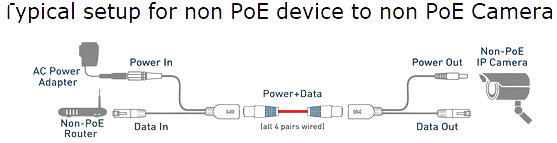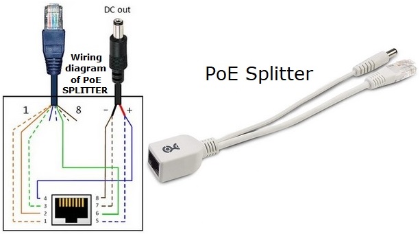 The female RG-45 connector receives the PoE Ethernet cable, then splits it to data only out on the RG-45 male connector, and DC on the male DC power jack.