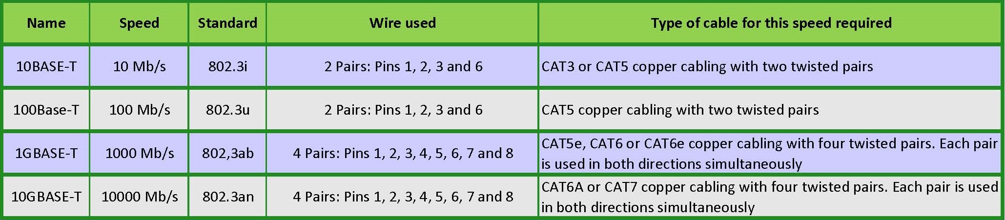 Types of standards in Ethernet Network communications wired with Twisted Pair (UTP & STP) cabling